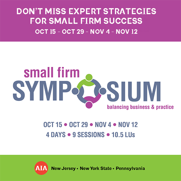 Back by popular demand the Tri-State Small Firm Symposium to be held on Across 4 Sessions in October and November. This will be a virtual program that will be sure to provide excellent insight and information for all small architecture firms. Optimize your firm with this online symposium that provides expert guidance on winning clients, improving operations, and harnessing innovative technology